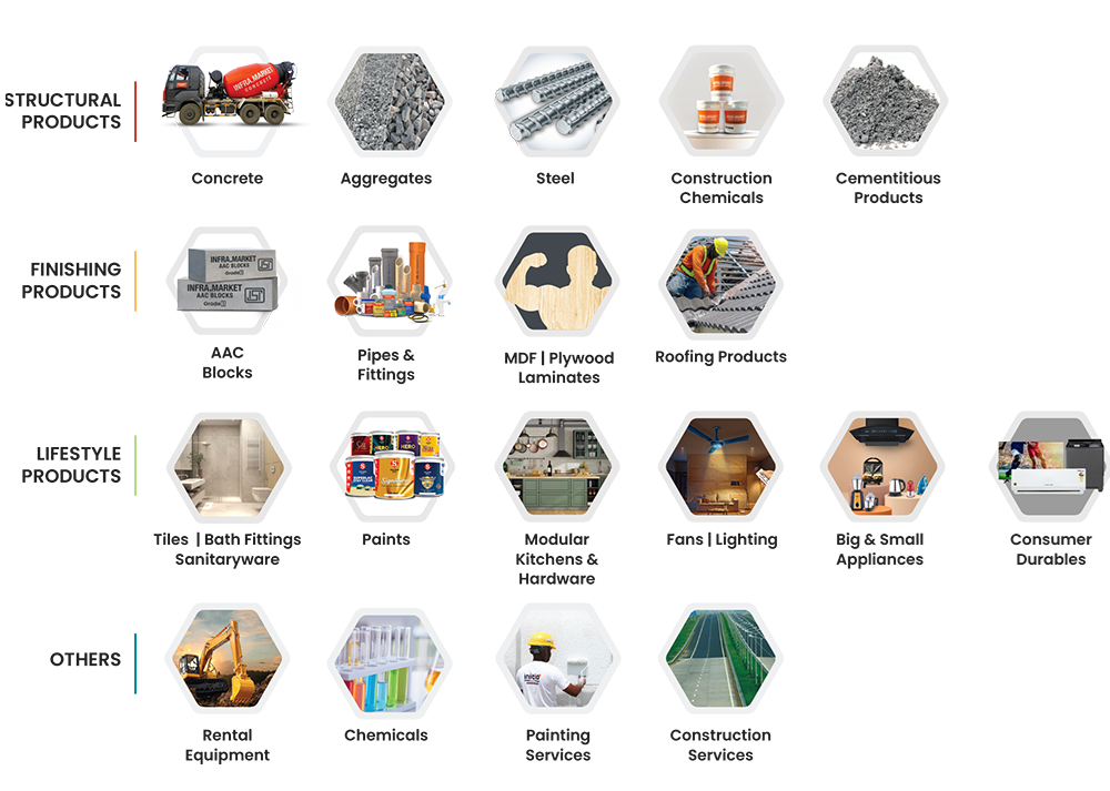 End-to-end product sourcing from structural materials (cement, steel, bricks) to finishing materials (tiles, paints, fixtures).